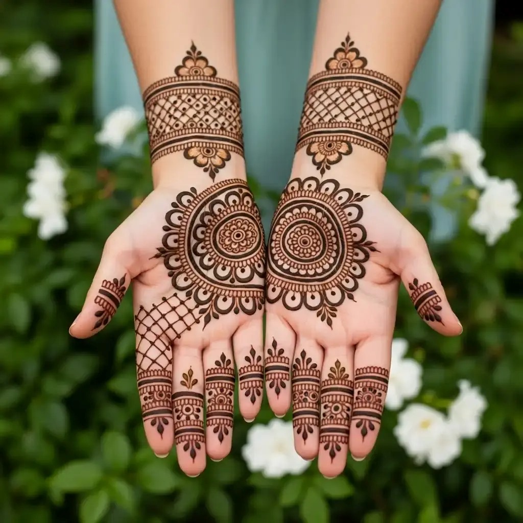 Such a floral mehendi design with a faint touch of lace appears so graceful and attractive. The complicated floral decorations are combined with the lace-like decorations to make the hands look graceful and stylish. This design is ideal when it comes to weddings, festivals, or any other special occasion and gives the classic mehendi a soft, feminine touch, which is also very beautiful.